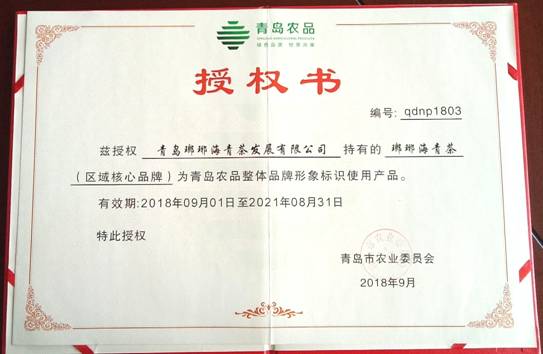 9月23日,在西海岸首屆農(nóng)民豐收節(jié)上,青島市農(nóng)委宣布“瑯琊海青茶”為首批“青島農(nóng)品”區(qū)域核心品牌,并頒發(fā)榮譽(yù)證書(shū)。
