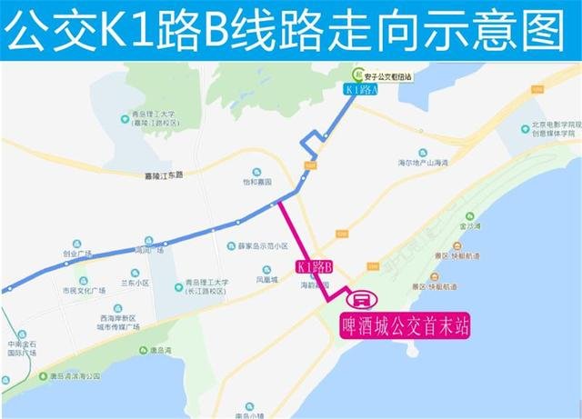 線路走向:由黃島輪渡發(fā)車(chē)按原線路運(yùn)行至海韻嘉園后,經(jīng)嘉陵江東路、金沙灘路到達(dá)啤酒城公交首末站。
